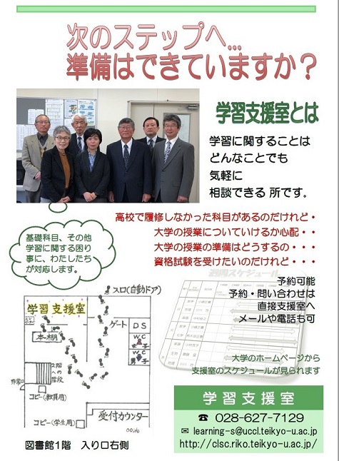 予約があれば優先します。 相談の申し込み https://docs.google.com/forms/d/e/1FAIpQLSezchpsPZmO5Gey1_PSCeXidL0FfqamJ1pvAgFb4sm6IXMmWA/viewform?usp=sf_link; 学習支援室電話 028-627-7129 予約メール learning-s@uccl.teikyo-u.ac.jp